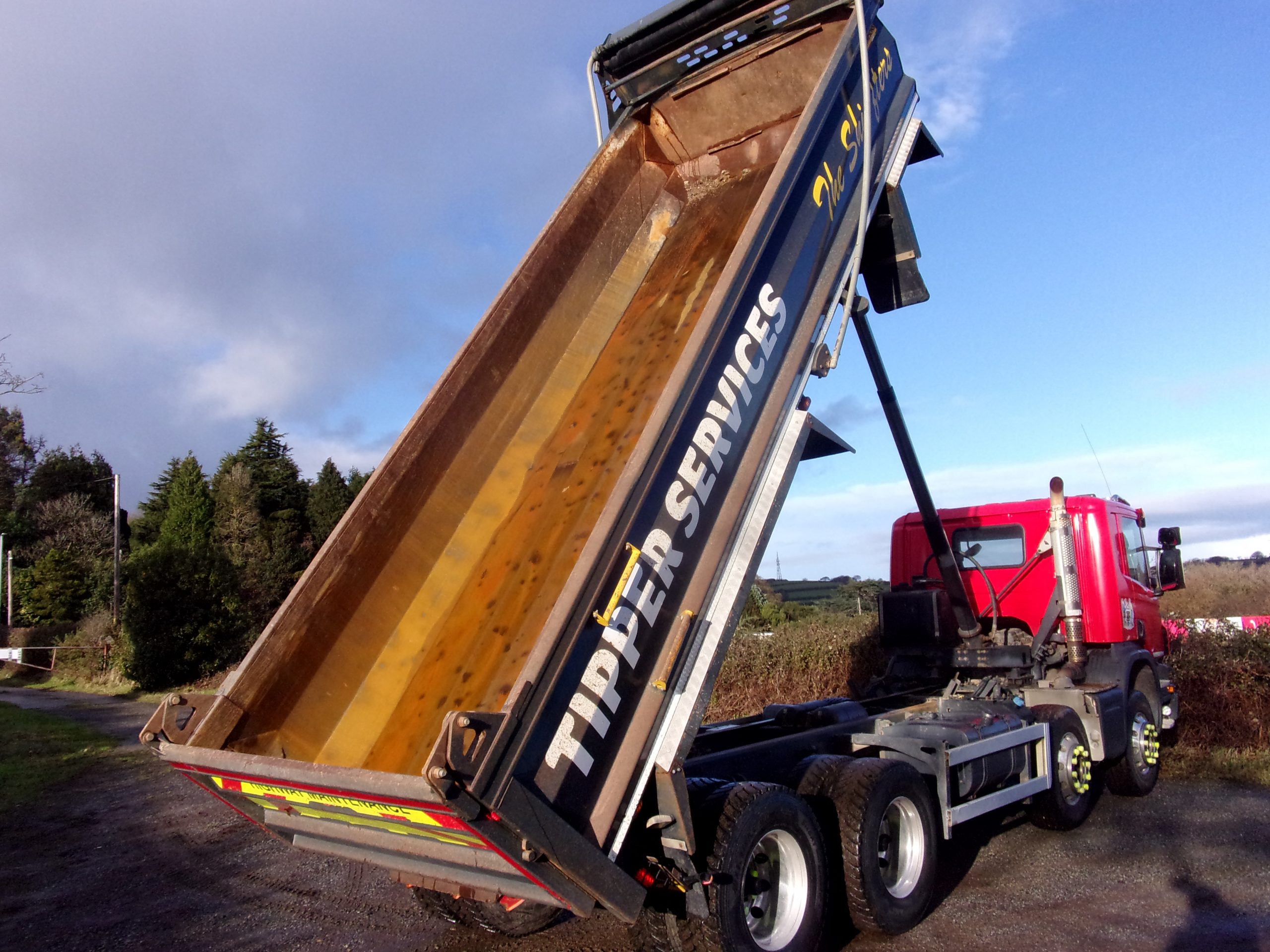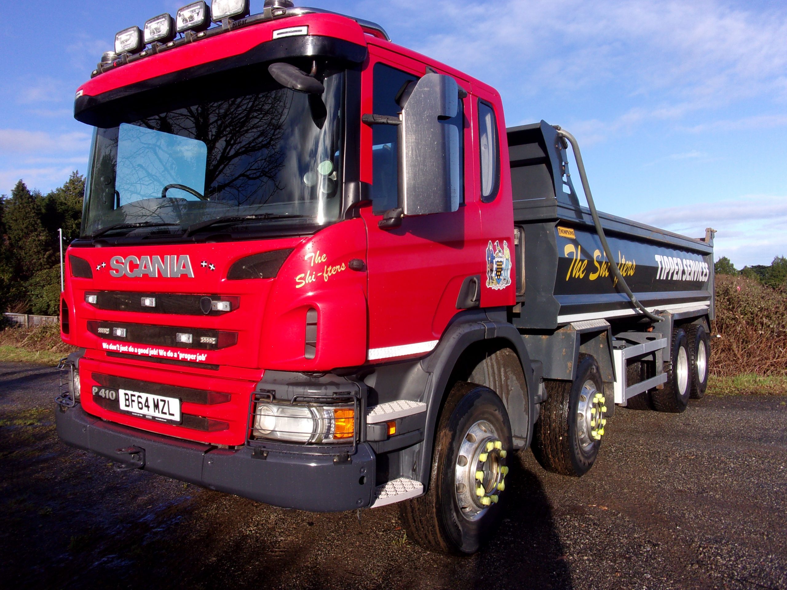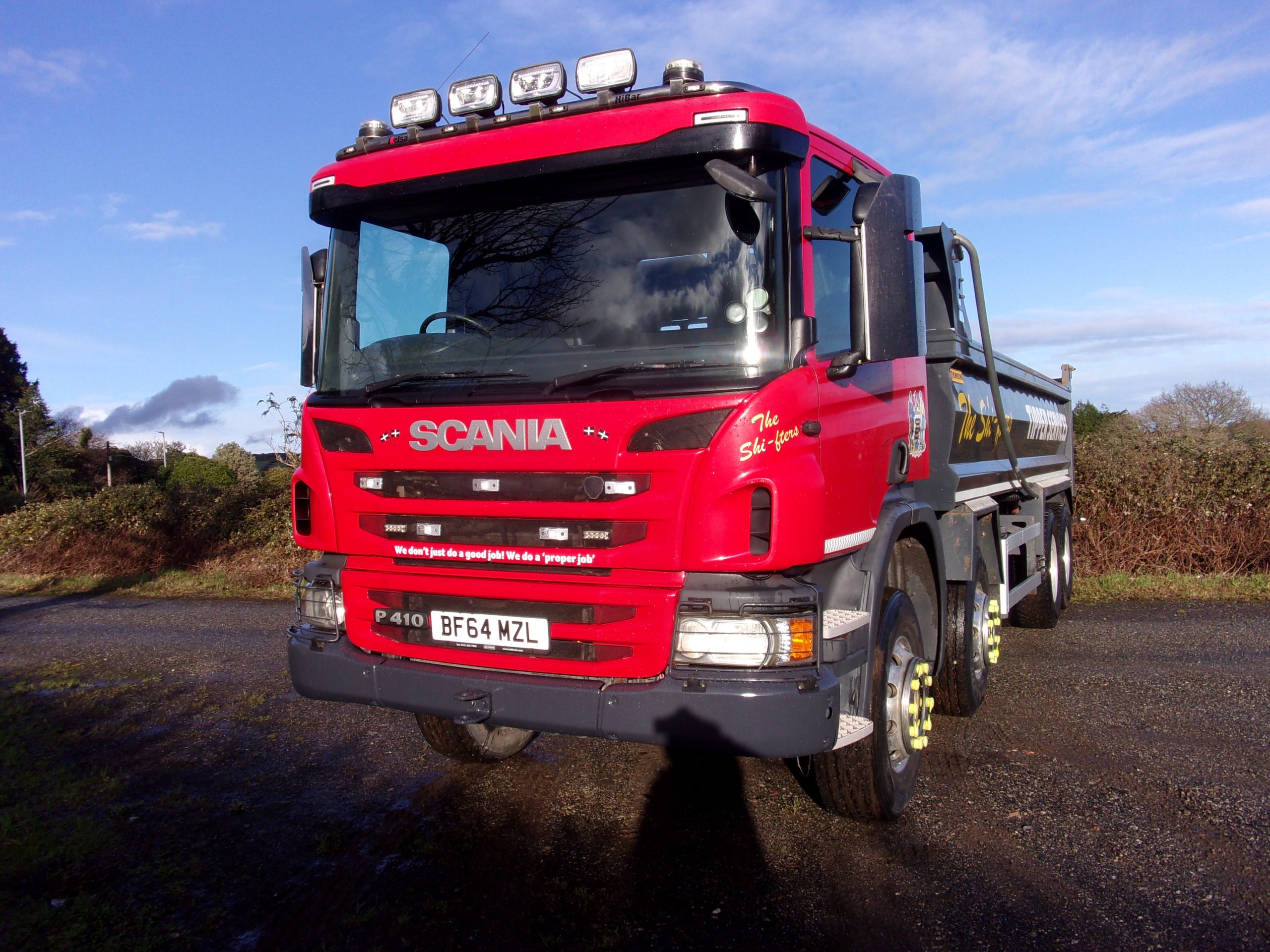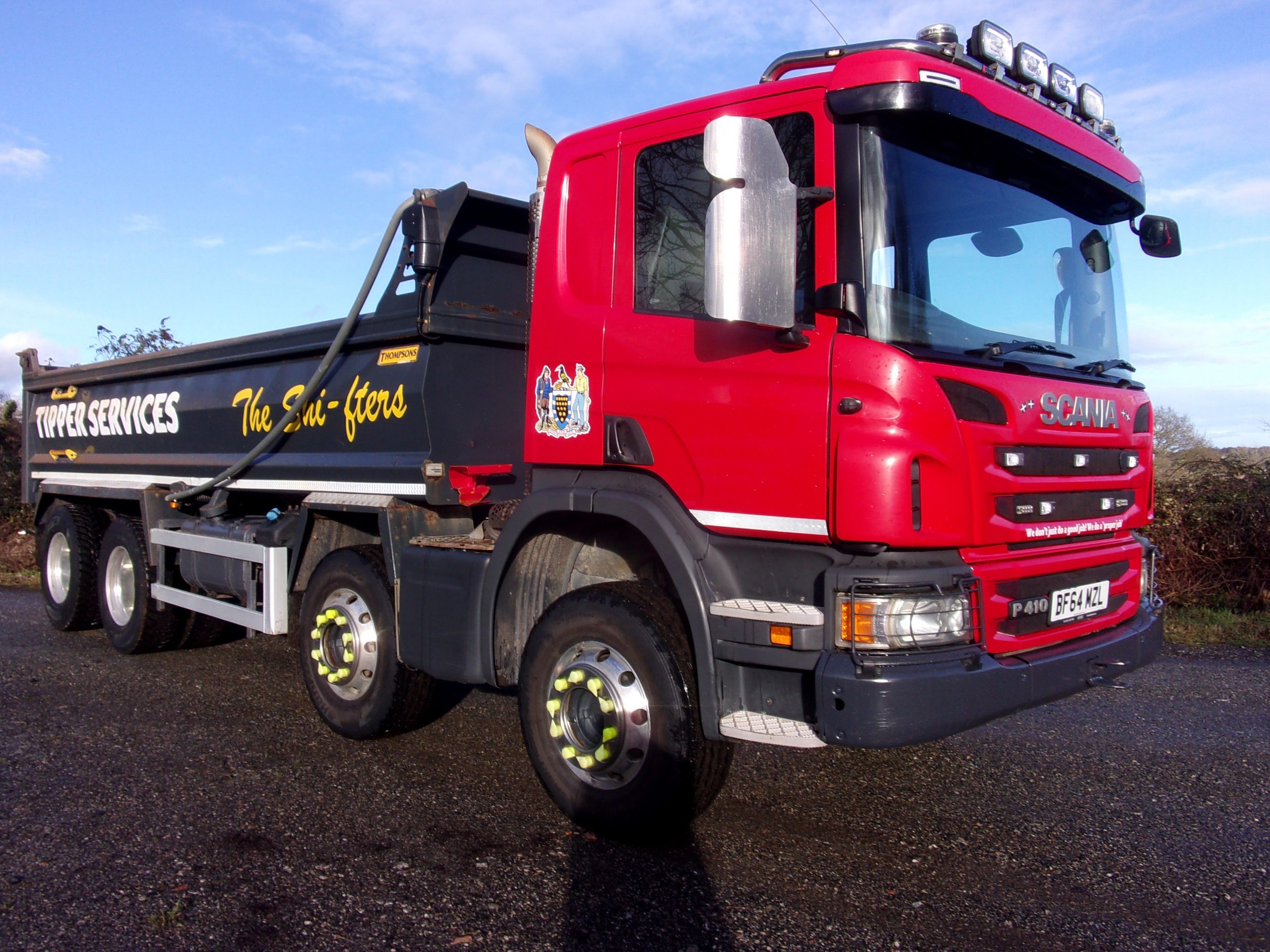 Scania P410 Day Cab 8×4 steel body 32 tonne tipper, 9 speed manual gearbox, onboard weigher, front-to-back sheet, air operated tailboard, alloy wheels, reverse camera, 388,016 miles, very clean.